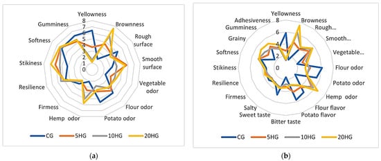 Spider plot representation of the QDA sensory analysis of control and hemp seed flour-enriched gnocchi samples: (a) raw samples; (b) cooked samples.