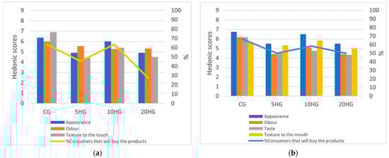 Combo chart representation of the hedonic consumer test for control and hemp seed flour-enriched gnocchi samples: (a) raw samples; (b) cooked samples.