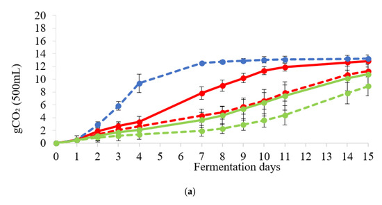 K. unispora and L. thermotolerans in pure fermentation showed slower fermentation kinetics than S. cerevisiae pure culture, both in their respective mixed fermentations and in both worts tested together. As expected, S. cerevisiae pure culture showed the highest fermentation kinetics compared to the other fermentation trials, with the maximum loss of CO2 within the first 3–4 days of fermentation in both PW and PWL worts. However, mixed fermentation (in both worts) and the presence of lentil (PWL)-enhanced fermentation kinetics of K. unispora and L. thermotolerans pure fermentations.