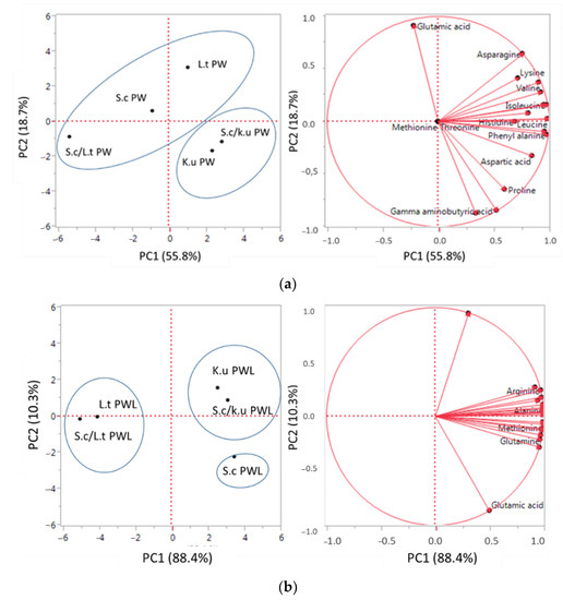 The trials carried out on PW (Figure 2a), K. unispora pure culture and mixed fermentations grouped in the lower right quadrant showed that K. unispora characterized the final amino acid content in mixed culture. Different behavior was exhibited by L. thermotolerans that in pure culture was in the right upper quadrant, in mixed (L. thermotolerans/S. cerevisiae) in the lower left quadrant, while S. cerevisiae pure culture was in an intermediate position highlighting a different effect of this yeast on the final amino acid content of the beer. The distribution of the trials carried out on PWL (Figure 2b) showed a more homogeneous distribution among pure and mixed fermentations. Indeed, K. unispora pure and mixed fermentations were in the right upper quadrant, L. thermotolerans pure and mixed trials on the line that separates the two left quadrants and S. cerevisiae in the lower right quadrant. These data indicated that K. unispora and L. thermotolerans affected the beer’s final amino acid composition compared with S. cerevisiae.