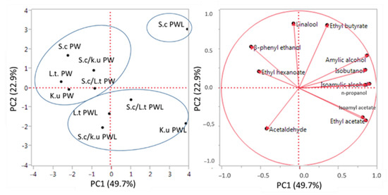 A different trend was shown in PWL, where the K. unispora pure culture increased ethyl acetate, while isobutanol and isoamyl acetate were comparable to that exhibited by K. unispora/S. cerevisiae, and L. thermotolerans/S. cerevisiae, respectively. Moreover, L. thermotolerans/S. cerevisiae led to a significant increase in β-phenyl ethanol compared to the other trials. L. thermotolerans showed a significant enhancement of acetaldehyde content, while S. cerevisiae was characterized by ethyl butyrate, ethyl acetate, and amylic and isoamylic alcohol.