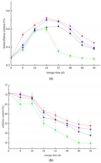 3.3. Effects of Different Treatments on Hemicellulose and Cellulose Contents in Blueberries