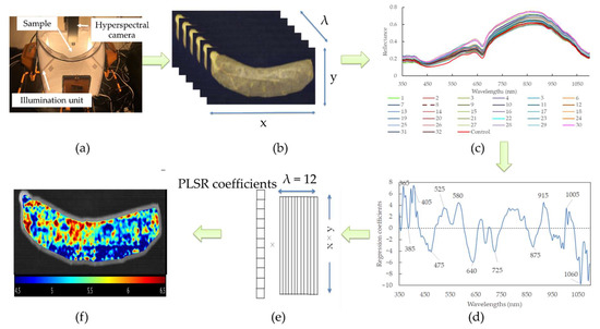 Flowchart of the main steps to design a hyperspectral imaging system for real-time monitoring of pH in sausages with different modified casings. (a) Imaging acquisition; (b) hyperspectral image segmentation; (c) spectral extraction; (d) feature wavelengths selection; (e) unfolded image to 2D and multiply the regression coefficients of PLSR model using feature wavelengths; (f) prediction map establishment.