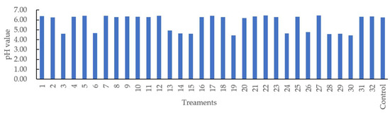 Figure 3 shows that the pH value varied from 4.44 (Treatments 19 and 30) to 6.46 (Treatment 22). Different casing treatments may have affected pH evaluation during the 16 days of storage under 4 °C. The R2 value of the regression model developed for pH was 67.13% with a nonsignificant lack of fit (p > 0.05). Only soy lecithin and orange extracts (X1 × X3) were observed to have interactively affected the pH of sausage at a 5% significance level (Table 2). The predicted quadratic polynomial regression equation for pH as a function of soy lecithin (X1), soy oil (X2), orange extracts (X3), lactic acid (X4), and treatment time (X5) in the uncoded units are shown as follows: