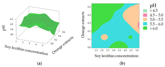 pH value of the sausages stuffed in modified casings as affected by soy lecithin concentration and addition of orange extracts (a); 2D contour plot (b).
