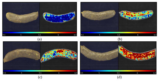As the main advantage of hyperspectral imaging technology, a prediction map (or distribution map) can illustrate where and how many different reference parameters (pH in the current study) are located from spot to spot in different detected samples. Figure 6 elaborates how pH changes in response to the different treated modified casings used for the sausages stored on Day 16. Four samples, the sample with the highest pH value (treatment 22, pH = 6.46), middle pH (Treatment 20, pH = 6.17), lowest pH (Treatment 30, pH = 4.44), and control group, were selected for representation. It is difficult to distinguish the differences in the RGB images with the naked eyes (Figure 6). Nevertheless, the prediction maps clearly show how much different pH values were located from pixel to pixel, which is superior to the conventional pH measurement, which is time-consuming and difficult to obtain the data like this. It is meaningful to monitor and understand the spatial change, which could provide useful information on how intrinsic properties such as the composition and biochemical attributes of samples react to different modified casings. To this point, it could serve as a good reference before those types of modified casings are commercially utilized.