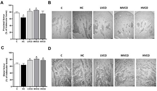 Effect of the HC diet and VCO supplementation on the percentage of trabecular bone in the proximal and distal femur. (A) The trabecular bone area and (B) histological sections of the proximal femur (scale bars represent 100 µm). (C) The trabecular bone area and (D) histological sections of the distal femur (scale bars represent 100 µm). Analyses were performed in mice fed a chow diet, high refined carbohydrate-containing (HC) diet, and HC diet supplemented with 1000 mg/kg (LVCO), 3000 mg/kg (MVCO), or 9000 mg/kg (HVCO) of body weight of virgin coconut oil (VCO). Values are means ± SEM (n = 8). * compared with the control (C) group (p < 0.05); # compared with HC group (p < 0.05).