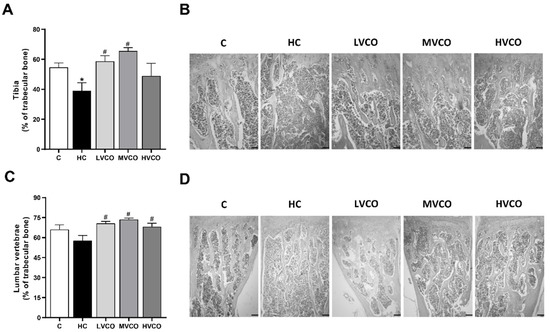 Effect of the HC diet and VCO supplementation on the percentage of trabecular bone in the tibia and lumbar vertebrae. (A) The trabecular bone area and (B) histological sections of the proximal tibia (scale bars represent 100 µm). (C) The trabecular bone area and (D) histological sections of lumbar vertebrae (scale bars represent 100 µm). Analyses were performed in mice fed a chow diet, high refined carbohydrate-containing (HC) diet, and HC diet supplemented with 1000 mg/kg (LVCO), 3000 mg/kg (MVCO), or 9000 mg/kg (HVCO) of body weight of virgin coconut oil (VCO). Values are means ± SEM (n = 8). * compared with the control (C) group (p < 0.05); # compared with HC group (p < 0.05).