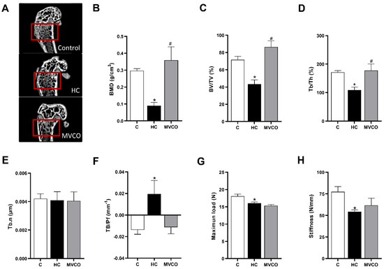 Micro-CT analysis of trabecular bone in the femur. (A) Representative femur images (small red squares represent the analyzed region on micro-CT). (B) Bone mineral density (BMD), (C) trabecular bone volume fraction (BV/TV), (D) trabecular thickness (Tb.Th), (E) trabecular number (Tb.N), (F) trabecular pattern factor (Tb.Pf), (G) bone maximum load and (H) stiffness of femur in mice fed chow diet (C), high refined carbohydrate-containing diet (HC), and HC diet supplemented with 3000 mg/kg body weight of virgin coconut oil (MVCO). Values are means ± SEM (n = 5). * compared with the control (C) group (p < 0.05); # compared with HC group (p < 0.05).