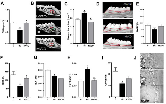 Micro-CT analysis of maxillary bone. (A) Bone mineral density (BMD), (B) representative images of maxillary (small red squares represent the analyzed region on micro-CT). (C) Alveolar bone loss, (D) representative images of the maxilla (the area outlined of CEJ-ABC represents the area of alveolar bone resorption). (E) Trabecular bone volume fraction (BV/TV), (F) trabecular thickness (Tb.Th), (G) trabecular number (Tb.N), (H) trabecular pattern factor (Tb.Pf) of the maxilla, (I) osteoblast number per bone perimeter (ObN/BPm) and (J) representative images of osteoblasts in mice fed a chow diet (C), high refined carbohydrate-containing diet (HC), and HC diet supplemented with 3000 mg/kg body weight of virgin coconut oil (MVCO). Values are means ± SEM (n = 5). * compared with the control (C) group (p < 0.05); # compared with HC group (p < 0.05).