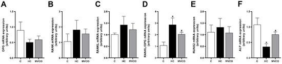 Effect of dietary VCO supplementation in the mRNA expression in the maxilla. (A) mRNA expression of Opg, (B) receptor activator of nuclear factor κB (Rank) and (C) receptor activator of nuclear factor κB ligand (Rankl). (D) Rankl/Opg ratio. (E) Runx2 and (F) Alp. Analyses were performed in mice fed a chow diet (C), high refined carbohydrate-containing diet (HC), and HC diet supplemented with 3000 mg/kg body weight of virgin coconut oil (MVCO). Values are means ± SEM (n = 5). * compared with the control (C) group (p < 0.05); # compared with HC group (p < 0.05).