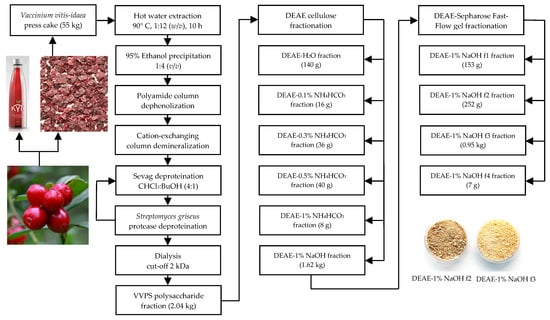 Flow chart for the extraction and fractionation of polysaccharides from Vaccinium vitis-idaea press cake. Abbreviation used: VVPS, V. vitis-idaea total polysaccharide fraction; DEAE, diethylaminoethyl cellulose; DEAE–sepharose fast-flow gel, diethylaminoethyl cellulose sepharose fast-flow gel.