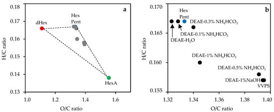 Nitrogen content was at a zero level (DEAE–0.5% NH4HCO3, DEAE–0.5% NH4HCO3), low (DEAE–0.3% NH4HCO3, DEAE–1% NaOH), or varied from 0.26% (VVPS) to 0.62% (DEAE–H2O), which agreed with the previous chemical composition data. To better visualize the elemental composition results, we used a Van Krevelen diagram [] to plot the atomic O/C ratio as a function of atomic H/C ratio (Figure 2).