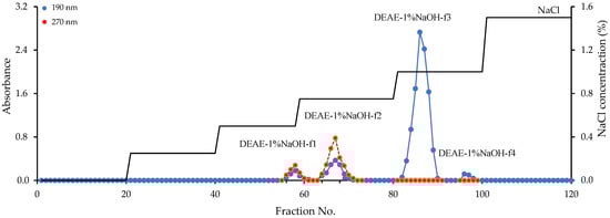 The solution of DEAE–1% NaOH (1.6 kg) in water (30 L) was passed through a DEAE–sepharose fast-flow gel column (2 L; GE Healthcare, Chicago, IL, USA) and eluted with water and NaCl solution (0.3%, 0.5%, 0.7%, 0.9%, 1.5%) for detecting the elution progress spectrophotometrically at 190 and 270 nm. All eluates were dialyzed in benzoylated dialysis tubes (cut-off of 2 kDa; Sigma-Aldrich, cat. No. D2272) against distilled water (48 h), and non-dialyzed residues were freeze-dried. The yields of the DEAE–sepharose fast-flow gel fractions were 153 g (DEAE–1% NaOH-f1; elution 0.5% NaCl), 252 g (DEAE–1% NaOH-f2; elution 0.7% NaCl), 0.95 kg (DEAE–1% NaOH-f3; elution 0.9% NaCl), and 7 g (DEAE–1% NaOH-f4; elution 1.5% NaCl).