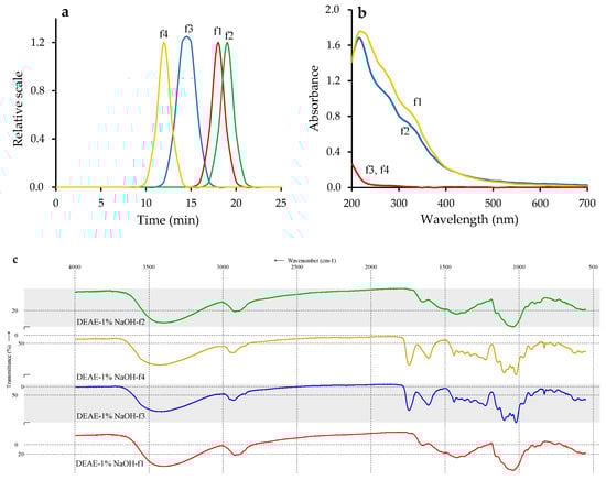 Characteristics of DEAE–sepharose fast-flow gel fractions of DEAE-1% NaOH-f1 (f1), DEAE-1% NaOH-f2 (f2), DEAE-1% NaOH-f3 (f3), and DEAE-1% NaOH-f4 (f4): (a) elution profiles on GP-HPLC; (b) UV–Vis spectra of 1 mg/mL water solutions; (c) FTIR spectra.