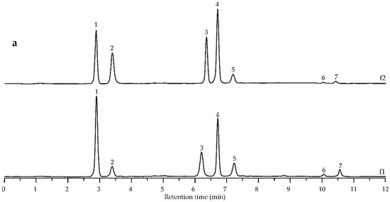To understand the chemical reasons for DEAE–1% NaOH-f1 and -f2 absorption in the UV spectral region, we degraded both polymers in KOH media followed by HPLC-PDA-MS analysis of the cleavage products. Alkaline hydrolysis of DEAE–1% NaOH-f1 and -f2 resulted in liberation of phenolic acids identified as ferulic acid (m/z 195; 29.5–38.4%), sinapic acid (m/z 225; 9.6–15.8%), diferulic acids (m/z 387; 47.3–51.9%), and disinapic acids (m/z 447; 2.8–4.7%) (Figure 5, Table 7). Monomeric acids (degradation products 1 and 2) were identified using reference standards, and diferulic and disinapic acids gave a specific combination of daughter ions in the MS/MS spectra, which allowed us to predict their structure. Mass spectral patterns of three diferulic acids 3, 4, and 5 were similar to previously described data of 5-5′-diferulic acid, 8-O-4′-diferulic acid, and 8-5′-diferulic acid, respectively (Figure S2) []. The spectra of disinapic acids 6 and 7 gave mass spectral patterns that were analogous to those of diferulic acids 3 and 4, but the basic ions were 60 amu larger owing to two methoxy functional groups in the sinapoyl fragments. The predicted structures of 6 and 7 degradation products were 2-2′-disinapic acid and 8-O-4′-disinapic acid, respectively (Figure S2). The obtained data showed evidence of polyphenol–polysaccharide conjugates with cross-linked structures of polymers DEAE–1% NaOH-f1 and -f2 esterified by ferulic and sinapic acid and their dimers.