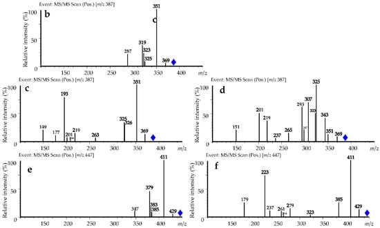 HPLC chromatogram of alkaline destruction products of DEAE–1% NaOH-f1 (f1) and DEAE–1% NaOH-f2 (f2) polymers (a) degradation products labeled 1–7 as described in Table 7 and ESI–MS/MS spectra (positive ionization) of degradation products 3 (b), 4 (c), 5 (d), 6 (e), and 7 (f).