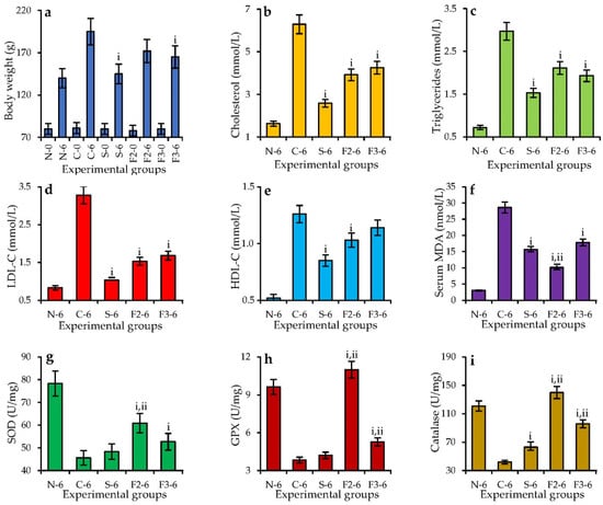 The experimental hyperlipidemia was reproduced using the recommendations of Cheng et al. [] with modification. Fifty male Golden Syrian hamsters (weight of 70–72 g; BioNursery Stezar, Vladimir, Russia) were housed one per cage with a 12 h light/dark cycle (humidity of 50–55%), and regular rodent cholesterol-free chow (Asortiment-Agro Company, Sergiev Posad, Russia) and free access to food and water were provided. After two weeks of adaptation, the animals were weighed and divided into five groups (n = 10): (1) the normal diet group; (2) the group with a 1% cholesterol supplementation diet; (3) the group with a 1% cholesterol supplementation diet + simvastatin; (4) the group with a 1% cholesterol supplementation diet + DEAE–1% NaOH-f2 polysaccharide; (5) the group with a 1% cholesterol supplementation diet + with 1% cholesterol diet + DEAE–1% NaOH-f3 polysaccharide. The diets of all groups were switched to a high-fat diet except for the normal diet group over a 3-month period. The general composition of the high-fat diet was 10% lard, 10% yoke powder, 1% cholesterol, and 79% regular rodent cholesterol-free chow. For the next six months, the animals were orally supplemented with simvastatin (10 mg/kg/day; group 3), DEAE–1% NaOH-f2 polysaccharide (250 mg/kg/day; group 4), and DEAE–1% NaOH-f3 polysaccharide (250 mg/kg/day; group 5). Animals in groups 1 and 2 received 0.9% NaCl solution. The experimental procedure was authorized by the Institute of General and Experimental Biology’s Ethical Committee (protocol No. LM-0324, 27 January 2012) before starting the study and was conducted under the internationally accepted principles for laboratory animal use and care. Serum concentrations of total cholesterol, triglycerides, high-density lipoprotein–cholesterol, and low-density lipoprotein–cholesterol were measured enzymatically using Sigma-Aldrich cholesterol assay kit (No. MAK436), serum triglyceride determination kit (No. TR0100), and HDL and LDL/VLDL quantitation kit (No. MAK045), and the malondialdehyde level was measured using a malondialdehyde colorimetric assay kit (Elabscience Biotechnology, Inc., Houston, TX, USA; No E-BC-K025-S). Liver superoxide dismutase, glutathione peroxidase, and catalase were determined using Sigma-Aldrich SOD assay kit (No. 19160), glutathione peroxidase assay kit (No. MAK437), and catalase assay kit (No. MAK100). All analyses were performed five times, and the data were expressed as mean values ± S.D.