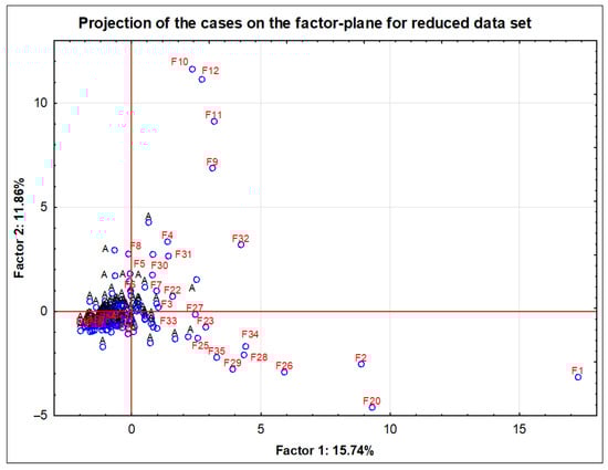 In the next step, the projection of cases on the factor plane for reduced data set was made. Since the significant influence of aging on the elemental profile of whisky had already been proven in earlier work, the age parameter was eliminated. Therefore, during the comparison of false and genuine samples, only the original samples were taken into account, which were aged for the legally required period (3 years).
