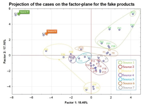 In the analyzed set of fake samples, nine different, independent sources were distinguished and according to this criterion a division was made and what is worth mentioning is the fact that within these separated groups, alcohol samples of a completely different nature were observed. This means that they were produced by one manufacturer, but some of them are “raw” products, i.e., distillates that have not undergone any treatment to change their color or taste, whereas others are finished products intended for sale and consumption. However, the tendency that can be noticed in the projection of the cases on the factor plane for the fake products presented in Figure 2 is the grouping of samples within a common source. Each group has been marked with a different color. Sources 8 (F2) and 9 (F1) are represented by single samples. Sample F1 (source 9) is distinguished by the highest values of Li, Mn, Sr and Ba in relation to the other counterfeit samples, hence its extreme position on the graph presented below. Within the source 1 (marked in green), a cluster of items from F30 to F32 can be distinguished. These are samples of the same alcohol coming probably from one production batch but taken from three independent bottles. It should be mentioned that this alcohol has been enriched with wood extracts in order to give it the characteristic whisky aromas. The other samples in this group are of a completely different nature. Moreover, samples F9–12 and F30–32 contain the highest concentrations of Cd in the tested set of false ones. For items F10–12, the permissible level of this element has been exceeded. The samples from sources 2, 4, 5 and 7 in Figure 2 form the most central, individual clusters. An interesting group is consisted of the samples from source 3 marked in yellow in Figure 2. Points F3, F22 and F24 are samples of high-strength distillates. In turn, samples F20, F26 and F34 are flavored products, which are made from these distillates. They have been enriched with sugar and fruit juices. These products were supposed to resemble whisky-based fruit liqueurs.