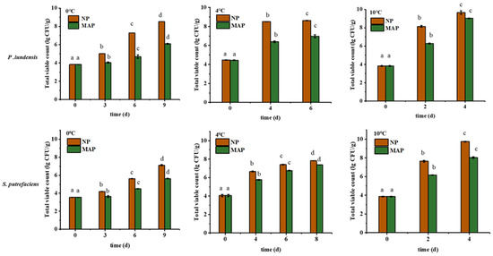 Growth of P. lundensis and S. putrefaciens in chilled chicken at 0 °C, 4 °C, and 10 °C. Lowercase letters: significance of dominant spoilage bacteria at different storage times.