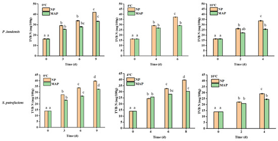 Chilled chicken contains a large amount of protein. Due to the microbial and endogenous enzyme activity, protein is degraded, resulting in the production of TVB-N. The accumulation of TVB-N can make the surface of chilled chicken moist and sticky, inelastic, and emit a bad smell. Thus, TVB-N is one of the evaluation indexes of meat corruption [16]. Figure 2 displays the TVB-N value in the different packaging methods. After 9 days of storage at 0 °C, the TVB-N values in the chicken samples of the NP and MAP groups inoculated with P. lundensis LD1 were 42 and 33.25 mg/100 g, respectively. Compared with the NP group, the TVB-N value of the MAP group decreased by 8.75 mg/100 g (p < 0.05). the TVB-N of the NP group inoculated with S. putrefaciens SP1 was 40 mg/100 g, which was 9.7 mg/100 g higher than that of the MAP group (p < 0.05).