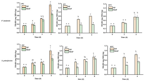 As shown in Figure 3, after 6 days of storage at 0 °C, the TBARS content of the NP group inoculated with P. lundensis LD1 was 0.66 mg MDA/kg. After 4 days of storage at 10 °C, 0.76 mg MDA/kg was detected. When the temperature increased, the absorption of oxygen by free radicals was enhanced, and the enzyme activity improved, thereby accelerating lipid oxidation. At 0 °C, 4 °C, and 10 °C, the MAP group inoculated with P. lundensis LD1 had 0.6, 0.39, and 0.45 mg MDA/kg on days 6, 4, and 2, respectively. The TBARS content slowly increased in the MAP group. The absence of oxygen in the MAP group reduced the oxygen uptake by meat and inhibited the activity of endogenous enzymes. Therefore, these factors slowed down the oxidation of highly unsaturated fatty acids to a certain extent. Similar to P. lundensis LD1, MAP also reduced the TBARS value in the NP group inoculated with S. putrefaciens SP1. Similar conclusions were drawn by Pongsetkul et al., who used dry fermented catfish as raw material and found that indicators such as oxidation products (PV and TBARS values) and sensory acceptability vary slowly under MAP and VP conditions. Shelf life was extended from 1–2 months at room temperature to 90 days [22]. Demirhan et al. also found that MAP inhibits microbial growth and delayed lipid and protein oxidation [23]. Thomas et al. proved that MAP protects the quality of chicken and extends its shelf life [24]. Chilled chicken contains a large amount of unsaturated fatty acids, which are highly sensitive to oxygen, thereby causing a reaction to generate free radicals and lipid peroxyl radicals. Lipid oxidation produces off-flavors and leads to rancid meat by breaking down lipid hydroperoxides into volatile aldehydes and ketones [25]. Chilled chicken can be protected from oxidation by the use of MAP technology and low-temperature storage conditions.