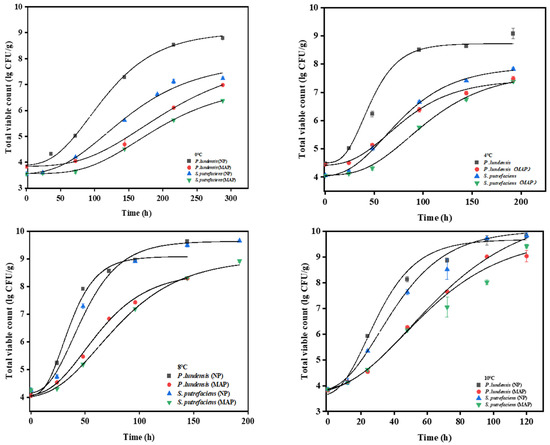 The growth data for P. lundensis LD1 and S. putrefaciens SP1 were obtained for the chilled chicken samples stored at 0–10 °C, equipped with a modified Gompertz model (Figure 4). With the increase in culture temperature, the retention period of dominant spoilage bacteria was shortened, and the maximum specific growth rate was accelerated. All models exhibited typical sigmoid shapes. As shown in Table 1, the lag period of the NP group inoculated with P. lundensis LD1 at 10 °C was 7.56, which was much lower than 39.28 at 0 °C. Notably, the changing rule of µmax showed the opposite trend. The µmax value of 0.14 at 10 °C was much higher than 0.035 at 0 °C. However, the NP groups inoculated with S. putrefaciens SP1 at 10 °C and 0 °C were fitted with the λ values of 8.99 and 45.93, respectively. At 0 °C, the maximum specific growth rate was 0.022, which meant that the microorganisms grew extremely slowly. Once raised to 10 °C, µmax was as high as 0.1, which was almost five times higher than at 0 °C. The enzyme activity increased at 10 °C, thereby accelerating the growth of microorganisms. When the storage temperature was constant, the lag period of the NP group of the two dominant spoilage bacteria was shorter than that of the MAP group, and the specific growth rate of the NP group was much greater than that of the MAP group. For example, at 4 °C, the lag phase of the NP group inoculated with P. lundensis LD1 was 19.35, and the maximum specific growth rate was 0.08. However, the lag period of the MAP group was prolonged by 7.67, and the specific growth rate was slowed down by 0.05. Similar trends were observed at other temperatures. These results on µmax and λ at different storage temperatures were consistent with the previous work [26].