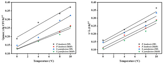 The above-modified Gompertz model could predict the growth of dominant spoilage bacteria at 0–10 °C, but it could not describe the effect of temperature on the number of dominant spoilage bacteria. The fresh-keeping temperature of chilled chicken during storage could only be maintained within a temperature range. Therefore, a second model was necessary. The Ratkowsky model was used to fit µmax and λ derived from the Gompertz model [28,29]. As shown in Figure 5, a good linear relationship was found between the temperature and the square root of µmax and the inverse of the square root of λ. The R2 values of and of P. lundensis LD1 were 0.943 and 0.983 under NP, corresponding to the MSE values of 0.01883 and 0.02089. Under MAP, they were 0.98 and 0.99, respectively, while the MSE values were 0.01018 and 0.0167. The R2 values corresponding to S. putrefaciens SP1 were all above 0.96, and the MSE values were all less than 0.01988. The lag phase and exponential growth phase play extremely important roles in microbial growth. Microorganisms generally do not grow immediately in the lag period. They live in a state of equilibrium, in which the number of cells maintains a dynamic balance; thus, the chilled chicken samples did not deteriorate during this period. The microorganisms in the exponential growth period have a strong metabolic capacity, which has a great impact on the quality of chilled chicken. µmax and λ can show the changes in dominant spoilage bacteria and have guiding roles in ensuring food safety. The µmax and λ of dominant spoilage bacteria in chilled chicken meat are most affected by temperature [30]. As shown in Figure 5, µmax increased with the temperature, whereas λ decreased with the increasing temperature. At 8–10 °C, significant growth was observed in terms of µmax and λ. When the temperature rose to the optimum growth temperature range of the dominant spoilage bacteria, the intracellular enzymes became active, and the metabolic rate increased, indicating rapid multiplication.