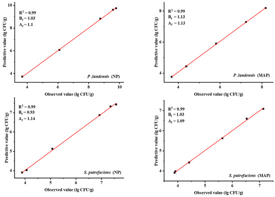 The applicability of the modified Gompertz model was verified through independent experiments. The observed values were compared with the predicted values in the experiments, and the models were mathematically evaluated using Bf, Af, and MSE [10].