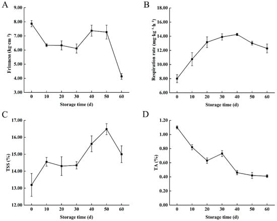 Physiological characteristics of ‘Fengtang’ plum fruits: (A) Firmness, (B) Respiration rate, (C) TSS, and (D) TA.