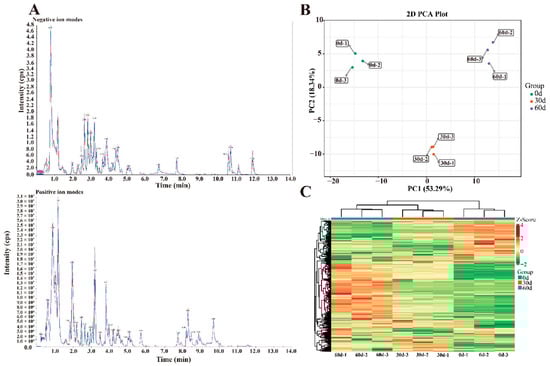 The total ion flow diagram (TIC) of the essential control of the plum sample in positive and negative ion modes overlapped (Figure 2A). The results show that the peaks and retention times of each sample overlapped, indicating that the systematic error of the experimental instrument is within the controllable range and that further analysis of the metabolomic data is reliable. In addition, 272 primary metabolites were analyzed using PCA. PC1 and PC2 were 53.29% and 18.34%, respectively, and the contribution of the two principal components was 71.63%; this suggests that the representative properties of approximately 71.63% of the metabolites were well aggregated, according to the 2D PCA scatter plots in Figure 2B. The QC samples were mixed, and the separation trend of metabolites among the three groups (0-, 30-, and 60-d) was apparent. The samples in each group were not separated, and the sample data were reliable to be used for subsequent analysis of differential metabolites.