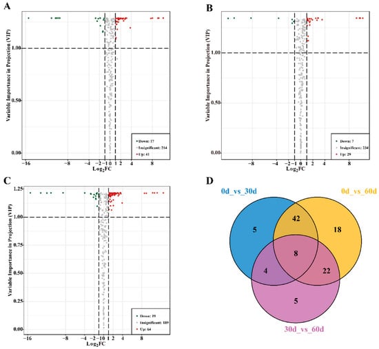 Screening of differential metabolites in ‘Fengtang’ plum fruits during storage: (A) Volcanic maps of differential metabolites at 0 d vs. 30 d, (B) Volcanic maps of differential metabolites at 30 d vs. 60 d, (C) Volcanic maps of differential metabolites at 0 d vs. 60 d. (D) Venn diagram of differential metabolites between groups.