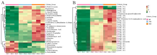 Heatmap of differential metabolites during storage of ‘Fengtang’ plum fruits: (A) Heatmap of amino acids and derivatives, and (B) Heatmap of lipids.