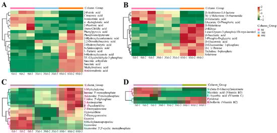 Heatmap of differential metabolites during storage of ‘Fengtang’ plum fruits: (A) Heatmap of organic acids, (B) Heatmap of saccharides and alcohols, (C) Heatmap of nucleotides and derivatives, and (D) Heatmap of vitamins.