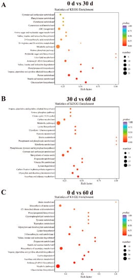 KEGG enrichment in ‘Fengtang’ plum fruits at different storage periods: (A) 0 d vs. 30 d, (B) 30 d vs. 60 d, and (C) 0 d vs. 60 d.