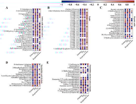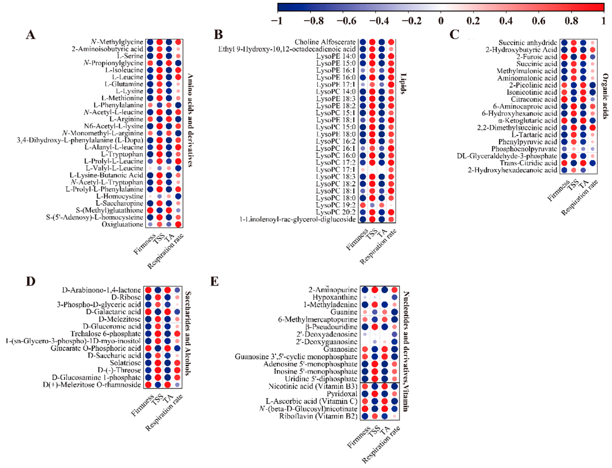 The correlation analysis between physiological characteristics and differential metabolites in ‘Fengtang’ plum fruits: (A) Amino acids and derivatives, (B) Lipids, (C) Organic acids, (D) Saccharides and alcohols, and (E) Nucleotides and derivatives, vitamins.
