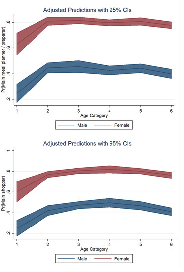 Margin plots were used to graph statistics from the fitted models shown above (Table 6). Figure 5 displays the marginal adjusted predictions for both sexes in all possible age categories. The largest difference with regard to food preparation duties between both sexes was found in individuals aged 18–24 years. A somewhat similar distribution was found with regard to shopping duties (Figure 5, lower panel).