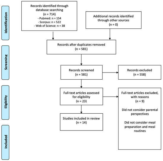 There were no restrictions other than those stated in the inclusion criteria above. Consequently, there was no demographic restriction other than age, and all study designs were considered eligible. The review discusses all the research articles published during the lockdown phases as identified by the literature search up to the time specified, offering a global overview from several countries. Literature, systematic, or narrative studies reviewing previous research were excluded using automatic search limits in databases; additionally, studies that considered chosen aspect(s) of parental perspectives on the family food environment (e.g., dietary patterns) in isolation from meal preparation and family interactions around food were also excluded from the synthesis.