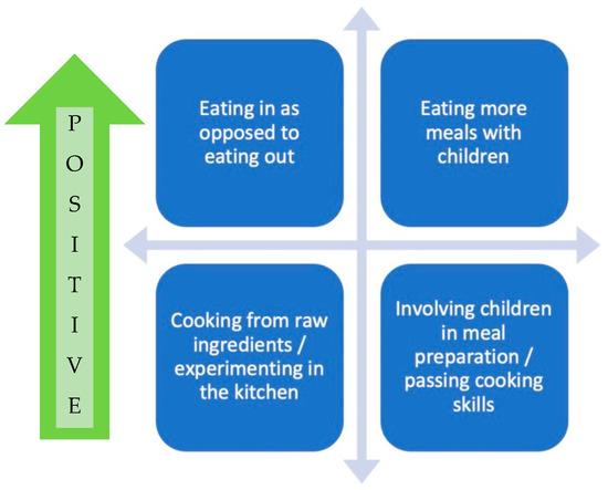 The majority of parents reported that their meal routines had changed for the better since COVID-19; favorable changes to their meal routines included eating home-cooked meals as opposed to eating out, eating more meals with children, and involving children in meal preparation. These positive trends were reported in all the studies and no negative changes were observed. Moreover, parents made healthier choices as a result of not being “on the go” [30], including making more meals from scratch [25] and experimenting in the kitchen [27,29]. Cooking with the child was a pleasurable activity [29,32] and an occasion to educate about food, to pass on certain cooking skills and values around food, and to taste new flavors [29]; additionally, as part of the meal preparation routine, parents also involved their children in gardening together [32,33]. One study reported that cooking skills confidence was associated with a higher frequency of including children in cooking activities, and that a higher intake of vegetables by parents was predictive of more frequent inclusion of children in cooking activities [24]. Others found that being a female parent predicted a higher/lower frequency of the child consuming home-made meals/food at restaurants [26]. Figure 3 shows the discussed changes to food preparation behaviors and meal routines.