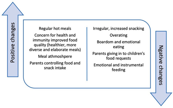 The impacts of COVID-19 on feeding behaviors in parents and subsequent eating behaviors in their children have been varied. Many positive changes in feeding and eating practices were observed during the lockdown, including increased consumption of hot and home-cooked lunches [32,33], and greater concern for health and immunity starting to impact food choices [27]; consequently, lunch quality also improved, including increased variety, more elaborate and complex meals, and healthier meals [32,33]. Moreover, eating at a calm pace had positive consequences for the meal atmosphere at home and on children’s eating behaviors [29], and being home together, made some parents more aware of their children’s SD consumption and/or help them to control it [30]. Children were also more interested in and likely to accept food they helped to prepare themselves [29]. On the other hand, changes in children’s daily routines during the COVID-19 pandemic had negative impacts on their eating behavior, such as overeating and eating frequency [25,27,28,35], increased intake of sugary drinks (SDs) [30] and snacks [29,30,34,37], and emotional eating [28,31]; one study also reported that children were skipping breakfast when attending school virtually [30]. Moreover, these negative changes in nutrition were accompanied by a more flexible and lenient parenting style, which further facilitated unhealthy eating in children [28,30,31,34]. One study did not report on this aspect of food-related parental perspectives [24].