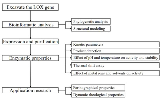 Lipoxygenases (LOXs) are a family of non-heme iron dioxygenases, which catalyze the regiospecific and stereospecific insertion of molecular oxygen in polyunsaturated fatty acids (PUFAs), containing 1-Z, 4-Z-pentadiene moieties into hydroperoxides fatty acid with (Z), (E)-diene conjugations [1,2,3]. LOXs have a broad potential for application in food, chemical, and pharmaceutical industries, of which the application prospects in dough products are due to the reinforcement effect by enhancing the gluten network [4,5]. LOX is extracted mainly from soybean powder [6,7,8,9], which contains multiple enzymes, and may reduce the catalyzing effects of LOX and produce unpleasant odor after the catalytic process, thus, limiting the application of LOXs in flour products [7,10,11]. Hence, the hunt for LOXs with desired properties has gained widespread attention for its application prospects in dough products.