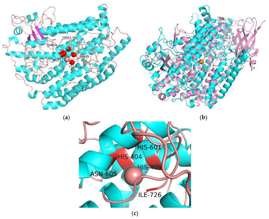 Molecular model depicting predicted structure of EnLOX and molecular model of soybean LOX-3. (a) The model structure of EnLOX. The α-helix (blue), strands (pink), and random coil (orange) of EnLOX. (b) Superposition of a soybean LOX-3 and an EnLOX. Soybean LOX-3 is shown in pink and EnLOX is shown in blue. (c) The catalytic key residues of EnLOX (His404-His409-His601-Asn605-Ile726). The orange sphere represents the iron ion in LOXs.