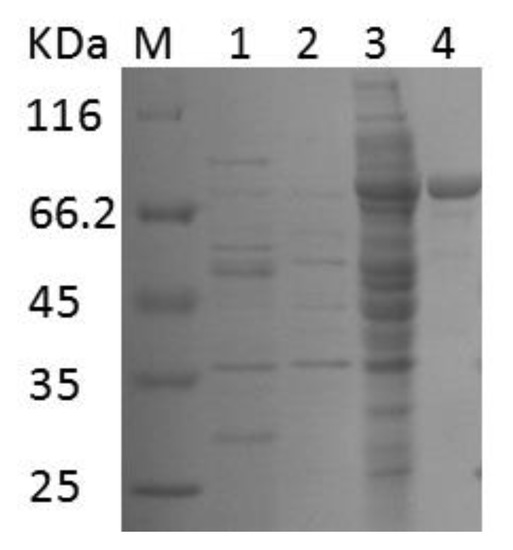 SDS-PAGE analysis of EnLOX expression and purification. M, protein molecular weight standard; Lane 1, E. coli/pET28a cell extracts; Lane 2, E. coli/pET28a-EnLOX of no-IPTG induced; Lane 3, E. coli/pET28a-EnLOX induced by IPTG for 16 h; Lane 4, EnLOX purified by Ni-NTA.