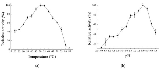 The effect of pH on EnLOX activity was measured from pH 3.0 to pH 9.5 using citrate sodium citrate buffer (pH 3.0–6.0), phosphate buffer solution (pH 6.0–7.0), Tris-HCl buffer (pH 7.0–9.0), and borax-sodium hydroxide buffer (pH 9.0–9.5) at 50 °C [32,33]. The highest activity of EnLOX as 100% to calculate the relative activities of varied pH value. To determine the pH stability, we measured the residual activity after incubating the enzyme in buffers with different pH at 4 °C for 10 h [3].