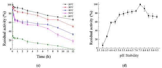 The activity of EnLOX was assayed at different pHs, as shown in Figure 4b. EnLOX showed activity in a wide range of pH 3.5–9.5 and had a maximum activity at pH 8.0. This result was consistent with the most reported optimum pH of LOXs, which are weakly alkaline [16,35,48,49]. EnLOX displayed excellent stability in assayed pH range (4.0–9.5); it could retain more than 50% relative activity after being incubated at 4 °C for 10 h, and it could retain above 70% relative activity at a broad pH range (5.0–9.5). Surprisingly, EnLOX remained above 90% relative activity at pH 7.5–8.0 after being stored at 4 °C for 10 h (Figure 5d). Excellent stability over a broad pH range may be due to the reversible denaturation of the enzyme, so that there is weak effect on the EnLOX activity on incubation at different pH [53]. Nevertheless, M. xanthus LOX is only stable in the range of pH 3.0–6.0 [1]. LOXs from soybean [46], B. thailandensis [15], and Cyanothece [54] are only stable under alkaline conditions. Therefore, EnLOX could be well-suited for industrial production, as it was stable in weak acidic and alkaline environment.