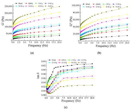Rheological characteristics of dough treated with different concentrations of EnLOX were evaluated (Figure 6). Dough samples added with EnLOX showed a significant increase in elastic value (G′) (Figure 6a) and viscous (G″) value (Figure 6b); both of the two values elevated with the increase in EnLOX concentration, revealing the good elasticity and extensibility of dough [4]. The degree of polymerization in dough can be described by tan δ (G″/G′) [60]. With the increase in the frequency, the tan δ value was always lower than 1.0 (Figure 6c), which suggested that elastic properties were more prominent, and the dough exhibits solid phase properties. Dough treated with 10–50 IU g−1 EnLOX exhibited higher elastic and viscous characteristics than that of the blank group, indicating that EnLOX could enhance the cross-linking of gluten [60]. EnLOX has been proven to have the reinforcement ability in wheat dough, similar to previously reported Anabaena LOX [4] and soybean LOX [46], indicating that the enzyme could be a potential enzymatic preparation [7].