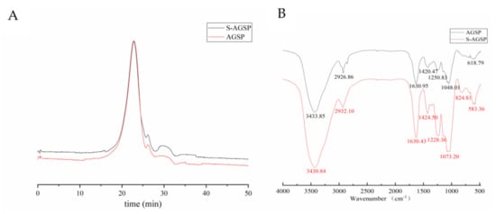 Characteristics of AGSP and S-AGSP. (A) Size exclusion chromatography profile of AGSP and S-AGSP. (B) IR spectra of AGSP and S-AGSP in the range of 4000–500 cm–1.
