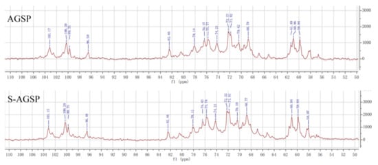 NMR spectra of AGSP and S-AGSP were compared to identify the sulfate substituent position after the sulfated derivatization reaction. The 1H-NMR (Figure S1) and 13C-NMR (Figure 2) of AGSP and S-AGSP showed almost identical signal peaks, except for strengthening of the chemical shift at 75.74 ppm in the 13C-NMR spectra of S-AGSP. No new chemical shift signal was detected in the 1H-NMR spectra of S-AGSP compared with that of AGSP. This result confirmed the 13C-NMR spectra result, which indicated that the sulfate group position in S-AGSP was the same as that of AGSP. The sulfate position in AGSP was previously reported to be at C4 of →3)-α-Gal (1→ residue []. Thus, the sulfate position in S-AGSP was also confirmed to be substituted at C4 of →3)-α-Gal (1→ residue.