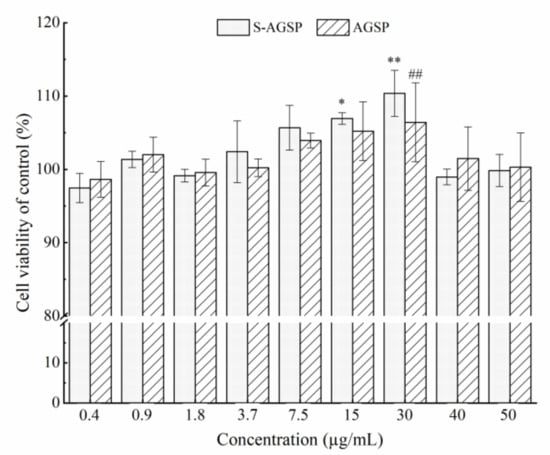 A Vero E6 cell line was obtained from Procell Life Science & Technology Co., Ltd. (Wuhan, Shanghai). Cells were cultured using Dulbecco’s modified Eagle’s medium (DMEM; HyClone, Logan, UT, USA) containing 10% fetal bovine serum (FBS; Biochrom, Berlin, Germany) and 1% penicillin/streptomycin solution at 37 °C in a humidified atmosphere with 5% CO2. Vero E6 cells were precultured on 96-well plates at a density of 5 × 104 cells/mL for 24 h. The medium was replaced and different concentrations of AGSP or S-AGSP (0, 0.4, 0.9, 1.8, 3.7, 7.5, 15, 30, 40 and 50 µg/mL) were added. After 24 h of incubation, 20 µL of 5 mg/mL 3-(4,5-dimethylthiazol-2-yl)-2,5-diphenyltetrazolium bromide (MTT) was added to each well for another 4 h of incubation. Next, MTT was replaced with 150 µL dimethyl sulfoxide (DMSO) and the plates were shaken for 8 min. The absorbance reading was recorded at 490 nm. All experiments were performed in triplicate.